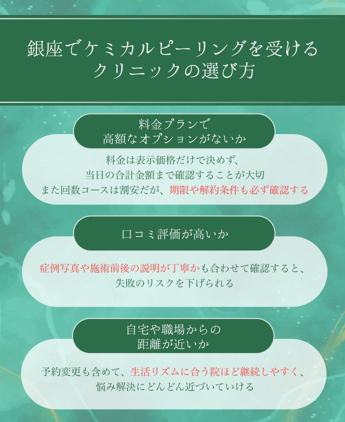 銀座エリアは仕事帰りに通いやすい店舗が多い一方、ピーリングの薬剤や料金、通い方はクリニックごとに差があります。
