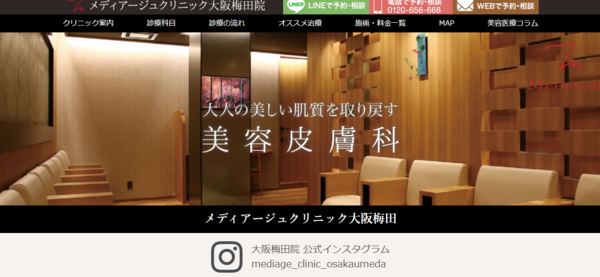 | メディアージュクリニック 大阪梅田院 | ![]() | 公式 | 詳細 | ・痛みや炎症が少ない「ベビーピール」が人気 ・大阪駅直結でアクセス抜群、仕事帰りにも最適 ・剥離しない最新ピーリングでエイジングケアも可能 |