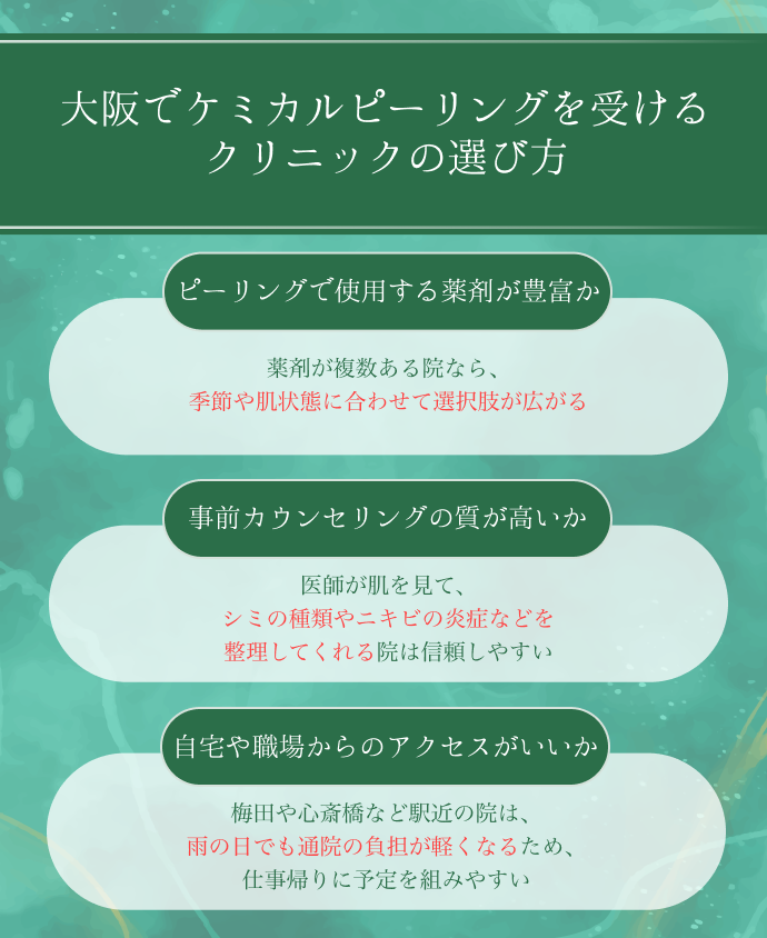 大阪には特色豊かなクリニックやサロンが揃っており、医療機関の本格ピーリングからエステ発のマイルドピーリングまで選択肢が豊富です。