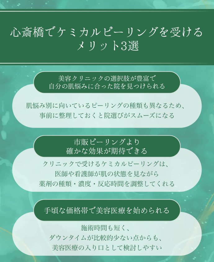 心斎橋は美容クリニックの選択肢が豊富で、ケミカルピーリングを受けるには恵まれた環境といえます。