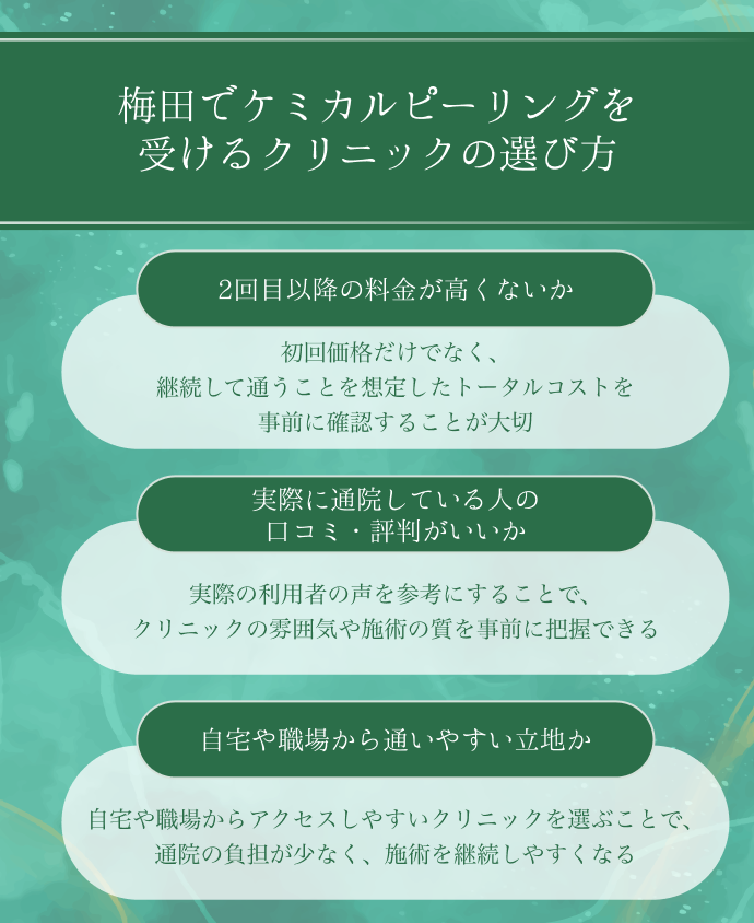 梅田でケミカルピーリングを受ける際には、薬剤の特徴やクリニック選びのポイント、メリット・デメリットをしっかり理解しておくことが大切です。