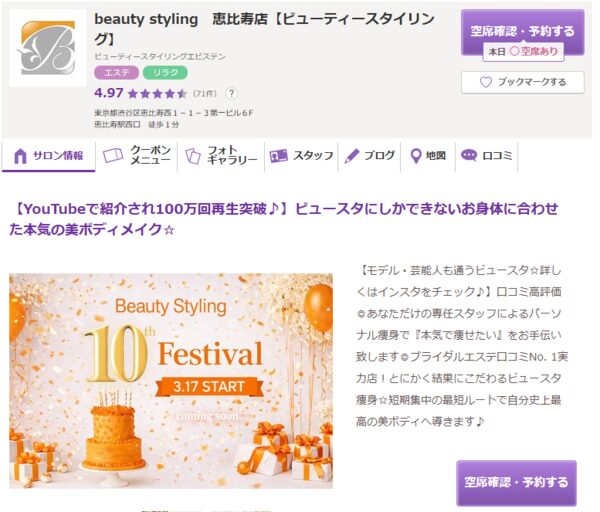 beauty styling 恵比寿店公式詳細・専任スタッフによるパーソナル痩身が強み