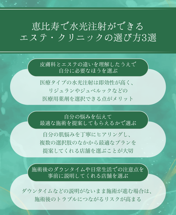 恵比寿で水光注射を受けたいけれど、どのサロンやクリニックを選べばよいか迷っている方は多いのではないでしょうか。