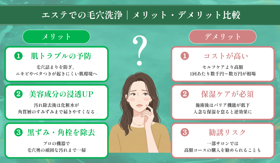 多くのメリットがある一方で、エステでの毛穴洗浄には、契約前にきちんと理解しておくべきデメリットや注意点も存在します。