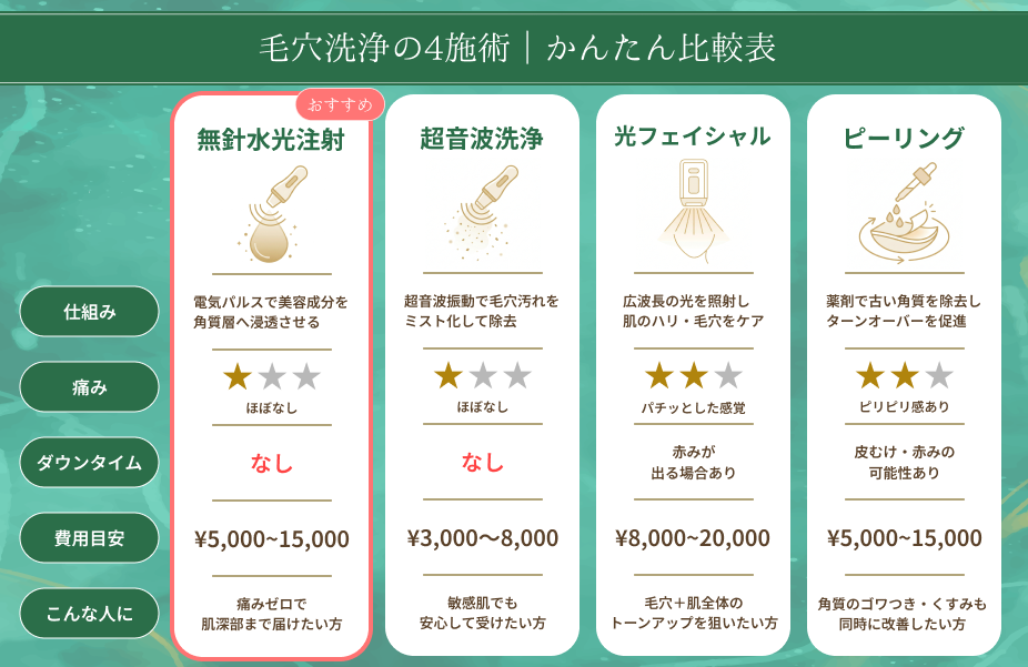 • 毛穴洗浄の種類は主に「無針水光注射」「超音波洗浄」「光フェイシャル」「ピーリング」の4つ
