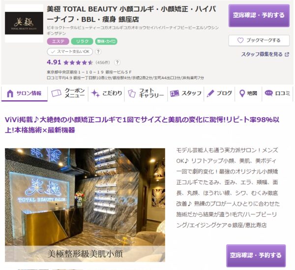 美極 TOTAL BEAUTY 銀座店は、ViVi掲載実績を持つ人気のトータルビューティーサロンです。