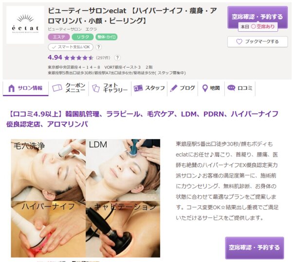 | ビューティーサロン eclat | ![]() | 公式 | 詳細 | ・韓国美肌管理に特化した完全予約制サロン ・ハイパーナイフEX優良認定店に選出 ・早朝8時から深夜23時30分まで営業 |