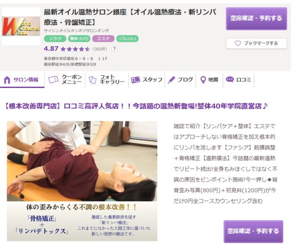 | 最新オイル温熱サロン銀座 | ![]() | 公式 | 詳細 | ・整体40年の学院直営で専門性が高い ・独自開発びわの葉オイルの温熱療法 ・モアレ診断で体の歪みを可視化し確認 |