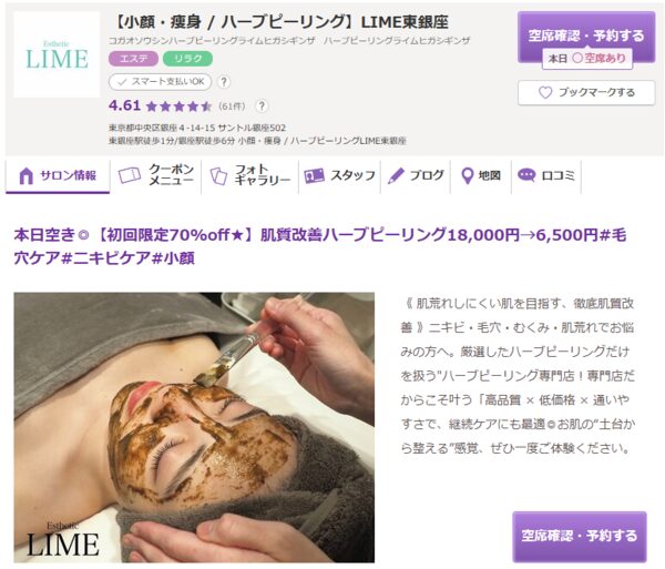 | LIME東銀座 | ![]() | 公式 | 詳細 | ・ハーブピーリング専門店の高品質施術 ・顔だけでなくボディのケアにも対応 ・初回6,500円で肌質改善を始められる |