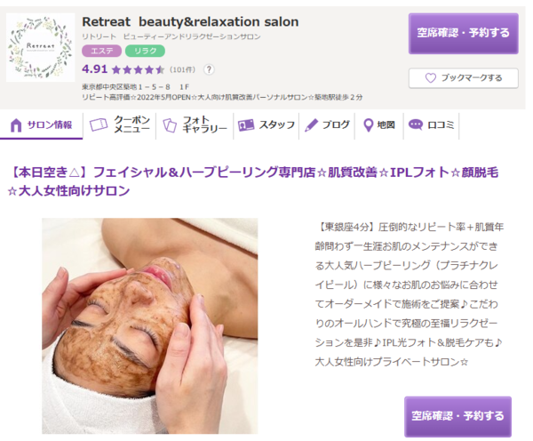 | Retreat beauty&relaxation salon | ![]() | 公式 | 詳細 | ・剥けないハーブピーリングの専門施術 ・オールハンドのオーダーメイド施術を提供 ・長期的な肌質メンテナンスに対応 |