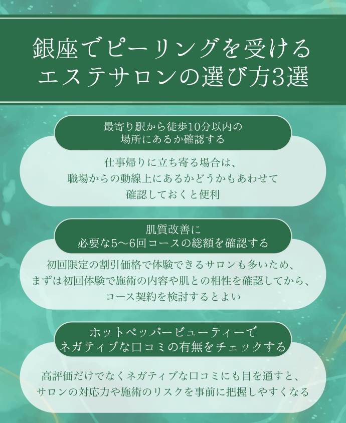 この記事では、銀座でピーリングが受けられるおすすめのエステサロン10院を紹介します。