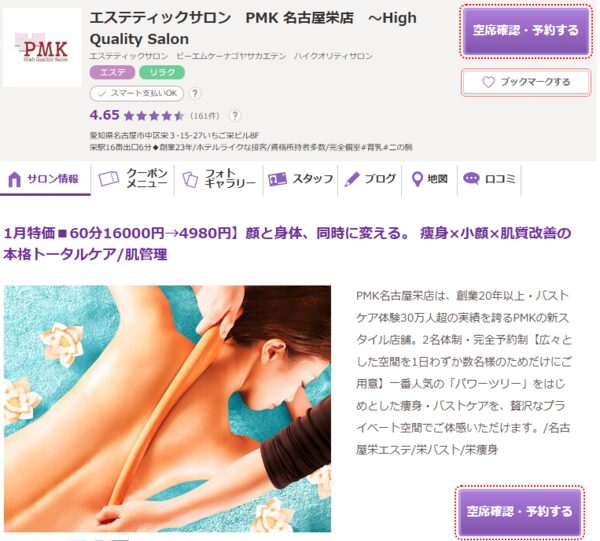 | PMK 名古屋栄店 | ![]() | 公式 | 詳細 | ・創業20年以上の信頼ある大手 ・最新診断機で肌状態を分析 ・全身の美をトータルサポート |