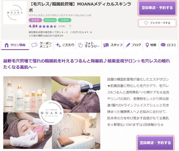 | MOANAメディカルスキンラボ | ![]() | 公式 | 詳細 | ・韓国式管理で陶器肌を目指す ・美容液毛穴洗浄で黒ずみ除去 ・久屋大通駅から徒歩2分 |