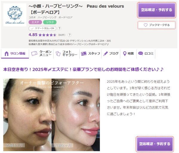 | Peau des velours | ![]() | 公式 | 詳細 | ・REVI陶肌トリートメントの人気店 ・韓国で話題のレモンボトル導入 ・久屋大通駅1番出口から30秒 |