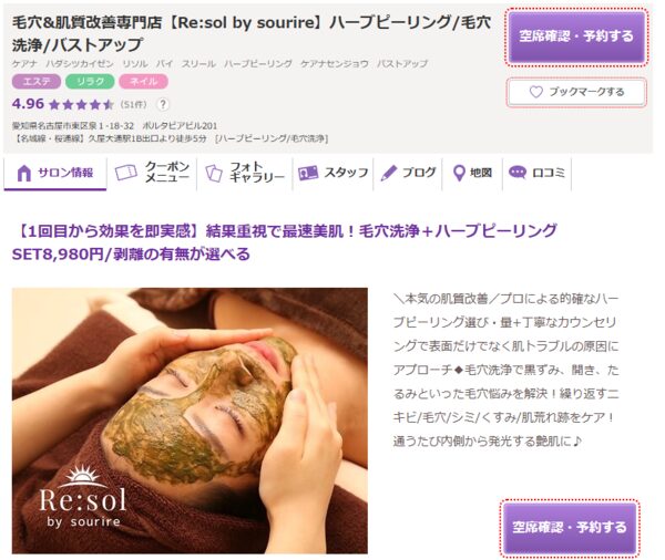 | Re:sol by sourire | ![]() | 公式 | 詳細 | ・毛穴洗浄とハーブピーリング ・剥離の有無を選べる丁寧な提案 ・久屋大通駅徒歩5分の隠れ家 |