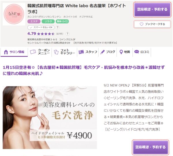 | White labo 名古屋栄 | ![]() | 公式 | 詳細 | ・名古屋初の韓国式肌管理専門店 ・水光肌へ導く最新メニュー ・初回体験が安く通いやすい |