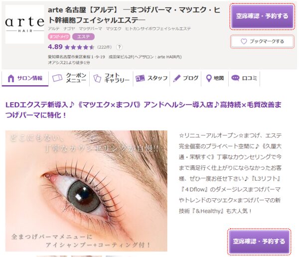 | arte 名古屋 | ![]() | 公式 | 詳細 | ・まつげとエステの同時施術可能 ・話題のヒト幹細胞培養液を使用 ・栄駅すぐオアシス21から1分 |