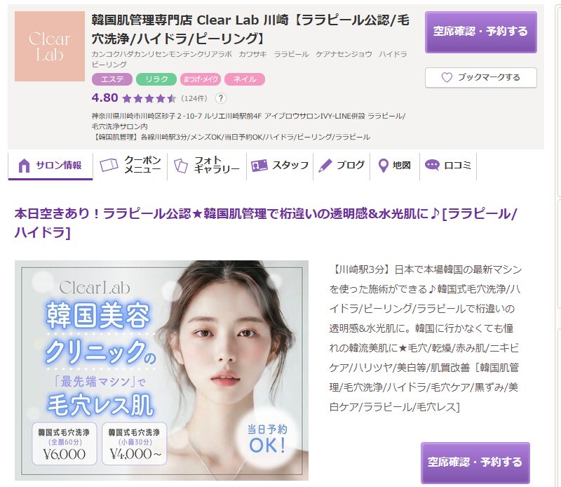 | 韓国肌管理専門店 Clear Lab 川崎 | ![]() | 公式 | 詳細 | ・本場韓国の最新マシンで韓国式肌管理 ・ララピール公認の次世代ピーリング対応 ・年中無休・当日予約OKで通いやすい |