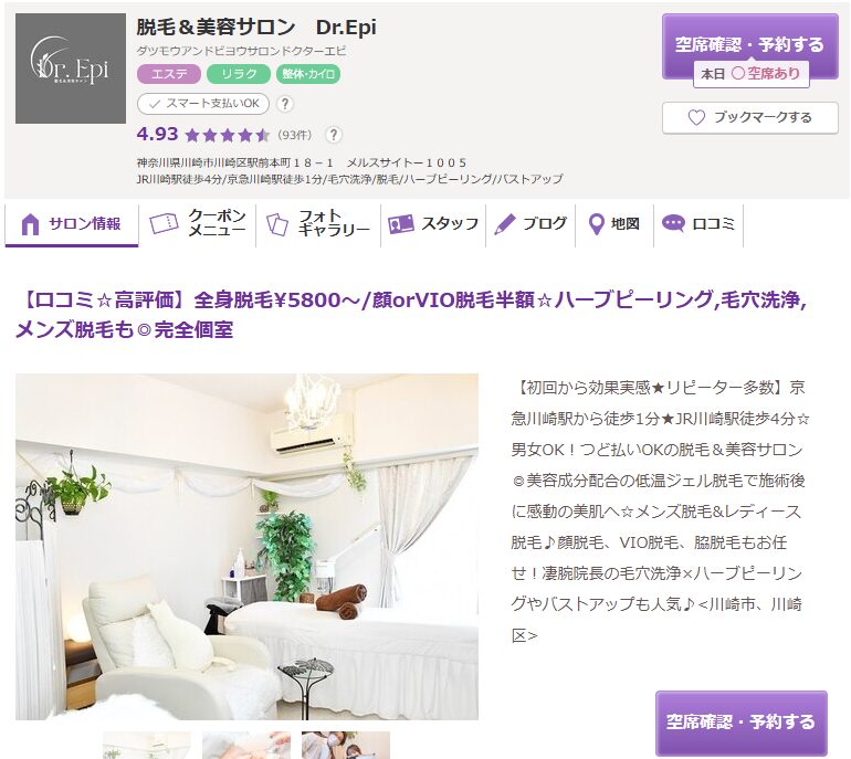 | Dr.Epi | ![]() | 公式 | 詳細 | ・京急川崎駅から徒歩1分の抜群アクセス ・口コミ評価4.93の高評価プライベートサロン ・都度払いOKでコース契約不要 |