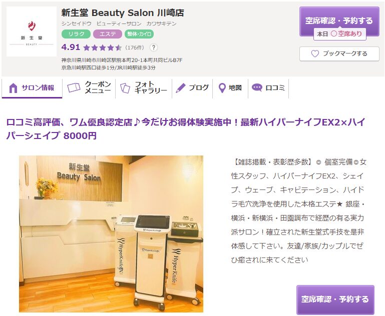 | 新生堂 Beauty Salon 川崎店 | ![]() | 公式 | 詳細 | ・雑誌掲載・表彰歴多数の本格派サロン ・ハイパーナイフEX2など最新痩身機器を完備 ・完全個室6室で23時まで年中無休営業 |