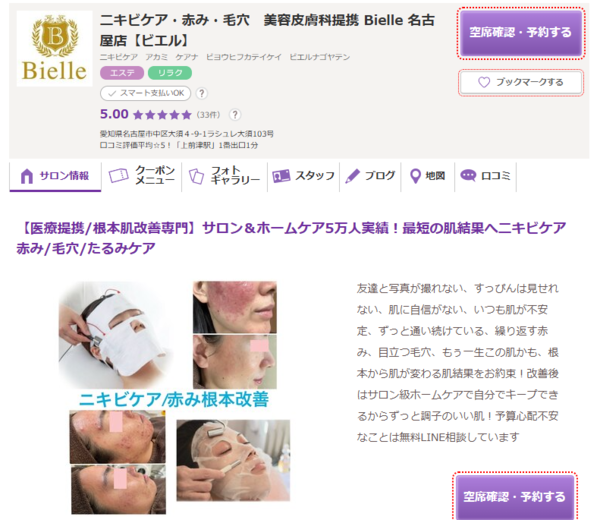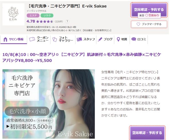 E‑vik Sakae | ![]() | 公式 | 詳細 | ・毛穴洗浄・ニキビケア専門サロン ・AIによる肌診断機を導入 ・ニキビの原因を徹底的に追及 |