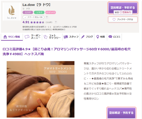 La.dow | ![]() | 公式 | 詳細 | ・口コミ平均4.9の高評価サロン ・極上アロマリンパマッサージ ・リラックスも毛穴ケアも両方叶う |