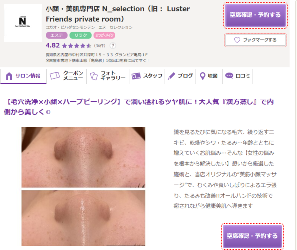 N_selection | ![]() | 公式 | 詳細 | ・小顔と美肌に特化した女性専用サロン ・オリジナルの「美筋小顔マッサージ」 ・内側から強い肌を育てる「肌育」ケア |