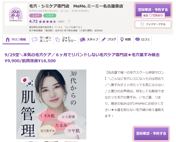 MeMe. | ![]() | 公式 | 詳細 | ・6ヶ月でリバウンドしない毛穴ケア ・名古屋で唯一の毛穴スクール併設 ・独自のメソッドで根本アプローチ |