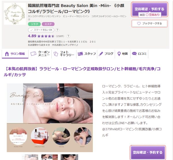 Beauty Salon Miin | ![]() | 公式 | 詳細 | ・本場韓国の肌管理と小顔コルギ ・韓国最新の美容メニューを正規取扱 ・結果重視のケアでお悩みを解消 |