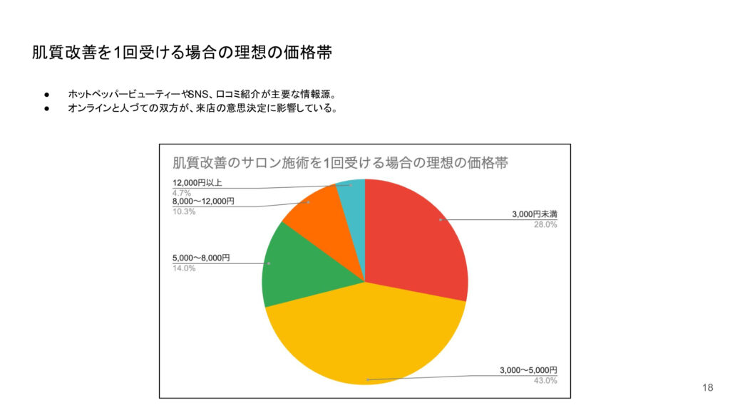 株式会社RiLiShの調査レポートによると、エステでの肌質改善は1回あたり3,000円〜5,000円が理想と考えている方が多いことがわかります。