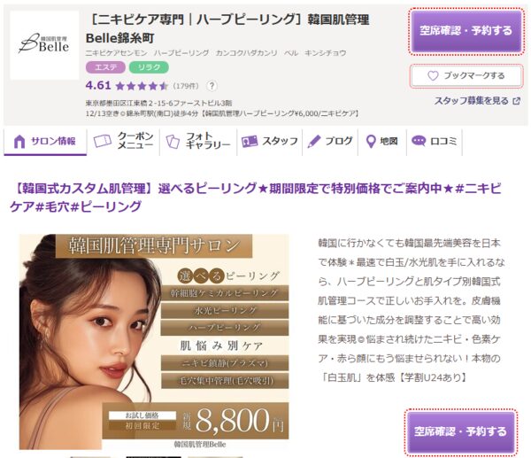 | 韓国肌管理Belle錦糸町 | ![]() | 公式 | 詳細 | ・本場韓国の水光肌を目指せるサロン ・最新機器とハーブピーリングの併用 ・K-Beautyの知識豊富なスタッフが対応 |