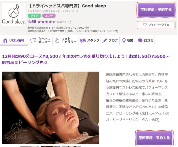 | Good sleep | ![]() | 公式 | 詳細 | ・睡眠改善ヘッドスパとピーリングの融合 ・自律神経を整え心身の疲労を回復 ・アロマ香る空間で極上のリラックス |