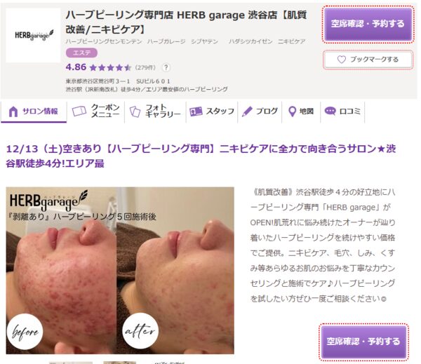 | HERB garage 渋谷店 | ![]() | 公式 | 詳細 | ・渋谷駅近で通いやすい好立地 ・続けやすい良心的な価格設定 ・ハーブピーリング専門店の高い技術力 |