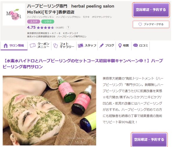 | MoTeKi 表参道店 | ![]() | 公式 | 詳細 | ・剥離なしのハーブピーリングを提供 ・ダウンタイムがなく直後からメイク可 ・高級感ある完全個室のプライベート空間 |