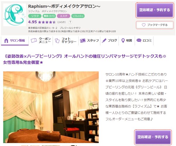 | Raphism | ![]() | 公式 | 詳細 | ・東洋と西洋の技術を融合した独自メソッド ・強圧リンパマッサージで全身デトックス ・体内から美を引き出すトータルケア |