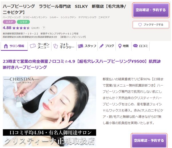 | SILKY 新宿店 | ![]() | 公式 | 詳細 | ・夜23時まで営業で仕事帰りも通いやすい ・肌質診断に基づいた最適な施術提案 ・全室個室でリラックスできる空間 |