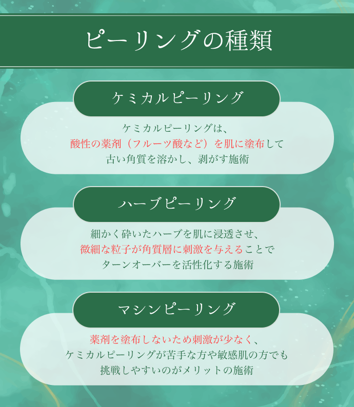 施術方法には大きく分けて、薬剤を使うケミカルピーリング、植物由来成分を使うハーブピーリング、専用機器で行うマシンピーリングの3種類があります。