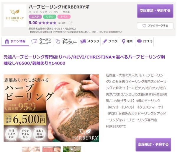 HERBERRY(ハーバリー)栄は、口コミ評価5.0を獲得しているハーブピーリング専門のサロンです。