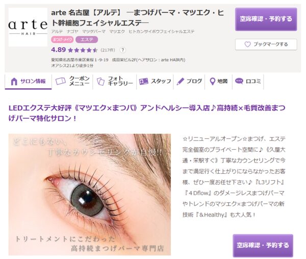 arte 名古屋は、まつげパーマやマツエクに加え、ヒト幹細胞フェイシャルエステも提供するトータルビューティーサロンです。