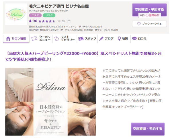 | 毛穴ニキビケア専門 ピリナ名古屋 | ![]() | 公式 | 詳細 | ・延べ3万人以上の施術実績 ・入会金やコース期限なし ・独自のフェイシャルエステ |
