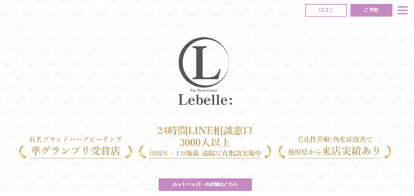 | Lebelle:(リベル) | ![]() | 公式 | 詳細 | ・10年間で1万件以上の施術実績 ・有名ブランド準グランプリ受賞 ・海洋深層水ベースの化粧品を使用 |