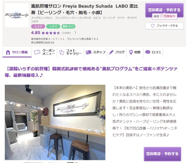| Suhada LABO 恵比寿 | ![]() | 公式 | 詳細 | ・美容院感覚で通える素肌管理専門サロン ・韓国式肌診断を取り入れたプログラム ・完全都度払い制でメンズも利用可能 |