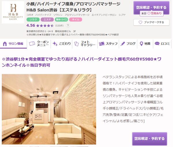 H&B Salon渋谷は、小顔矯正・毛穴洗浄・アロマリンパマッサージを柱とする総合美容サロンです。