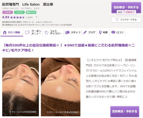 | Life Salon 恵比寿 | ![]() | 公式 | 詳細 | ・ニキビと毛穴ケアに特化した肌管理専門 ・毎月500件以上の施術実績でSNSでも話題 ・最先端機器によるオーダーメイドの施術 |
