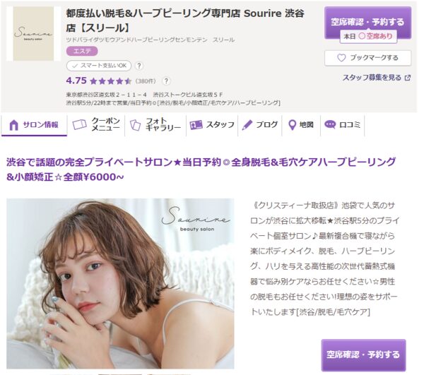 Sourire渋谷店は、都度払い専門のハーブピーリング&脱毛サロンです。