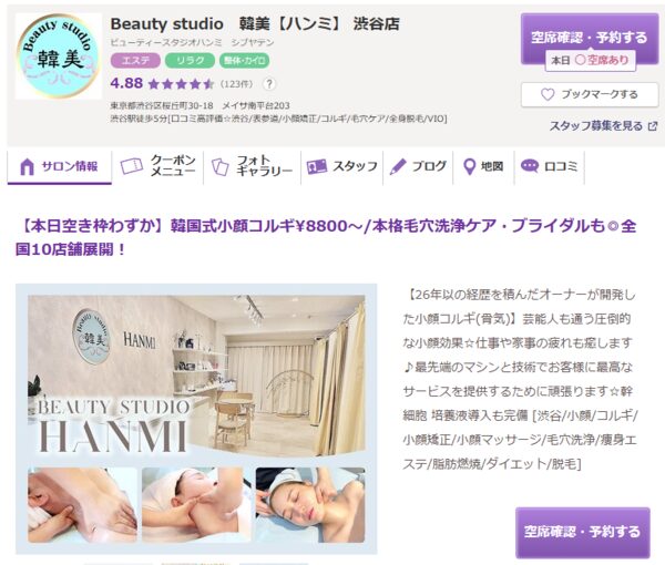 | 韓美 渋谷店 | ![]() | 公式 | 詳細 | ・韓国式小顔コルギと毛穴ケアを専門に提供 ・累計1万人以上の肌改善実績を誇る技術 ・全国10店舗展開で22時まで営業し通いやすい |