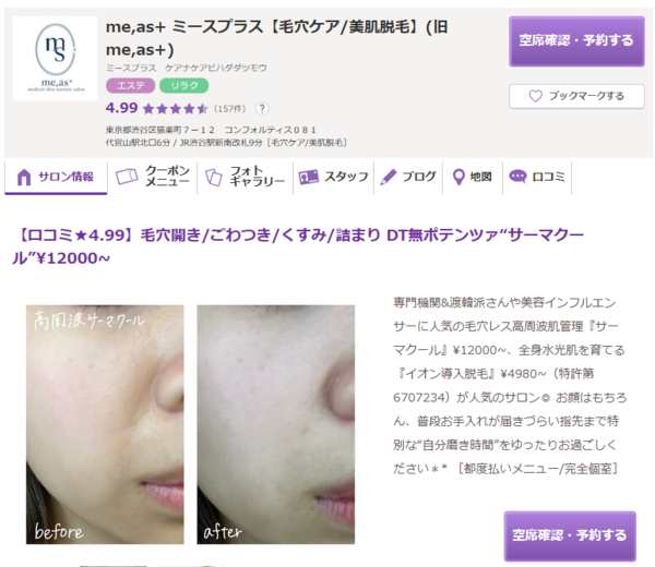| me,as+ ミースプラス | ![]() | 公式 | 詳細 | ・高周波サーマクールと美肌脱毛が専門 ・脱毛と肌質改善を同時に叶えるメニュー ・平日は22時まで営業のプライベート空間 |