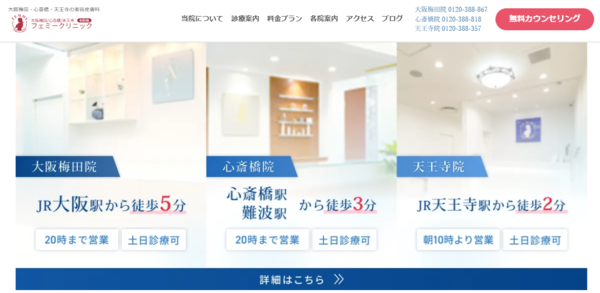 心斎橋フェミークリニックは、大阪に3院を展開する美容皮膚科フェミークリニックグループの一つで、患者一人ひとりの悩みに寄り添ったオーダーメイド治療に定評があります。