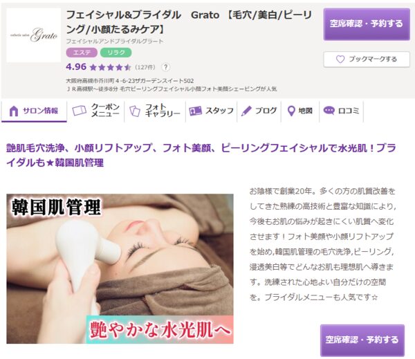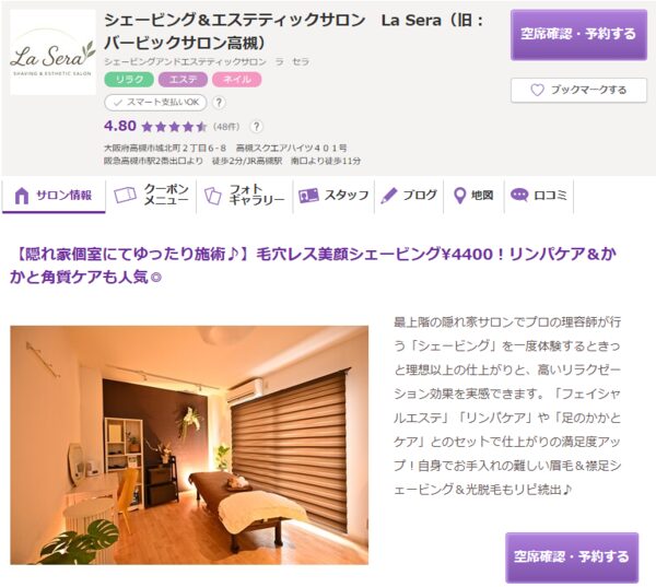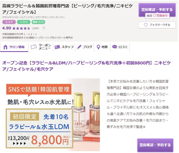 | 高槻ララピール&韓国肌管理専門店 | ![]() | 公式 | 詳細 | ・韓国ハーブピーリングとララピールに特化 ・都度払いや回数券など柔軟な通い方を提供 ・ブライダル前の集中ケアとしても利用可能 |