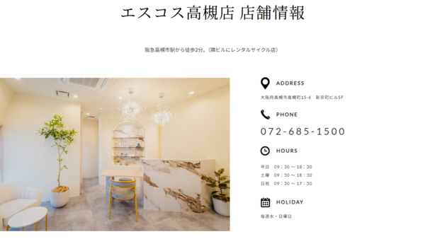 | エステサロン名 | エスコス 高槻店 |